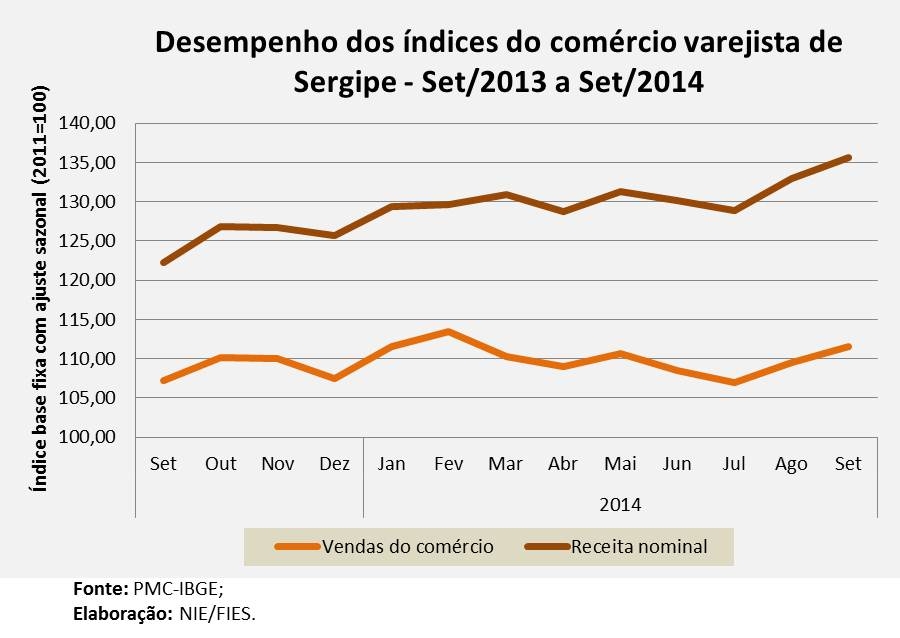 Análise realizada pelo Boletim Sergipe Econômico, parceria do Núcleo de Informações Econômicas da Federação das Indústrias do Estado de Sergipe (FIES) e do Departamento de Economia da UFS, com base nos dados da Pesquisa Mensal do Comércio (PMC) do IBGE, revelou que as vendas do comércio varejista do estado, no nono mês de 2014, apresentaram elevação de 5,6% em relação ao mesmo mês do ano passado. Nesse tipo de comparação, classificada como interanual, verificou-se que após quedas na vendas nos meses de junho, julho e agosto deste ano, as vendas melhoraram e registraram elevação no último mês de setembro.