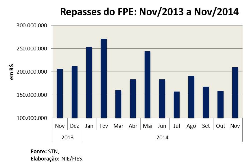 Análise realizada pelo Boletim Sergipe Econômico, parceria do Núcleo de Informações Econômicas da Federação das Indústrias do Estado de Sergipe (FIES) e do Departamento de Economia da UFS, com base nos dados da Secretaria do Tesouro Nacional (STN), indicou que a transferência do Fundo de Participação dos Estados (FPE) para Sergipe foi de R$ 209,9 milhões, no décimo primeiro mês do ano, assinalando leve retração real (descontada a inflação do período) de 4,4% em relação ao mesmo mês de 2013. No comparativo com o mês imediatamente anterior, os repasses do FPE foram 31,7% maiores, também descontando a inflação.