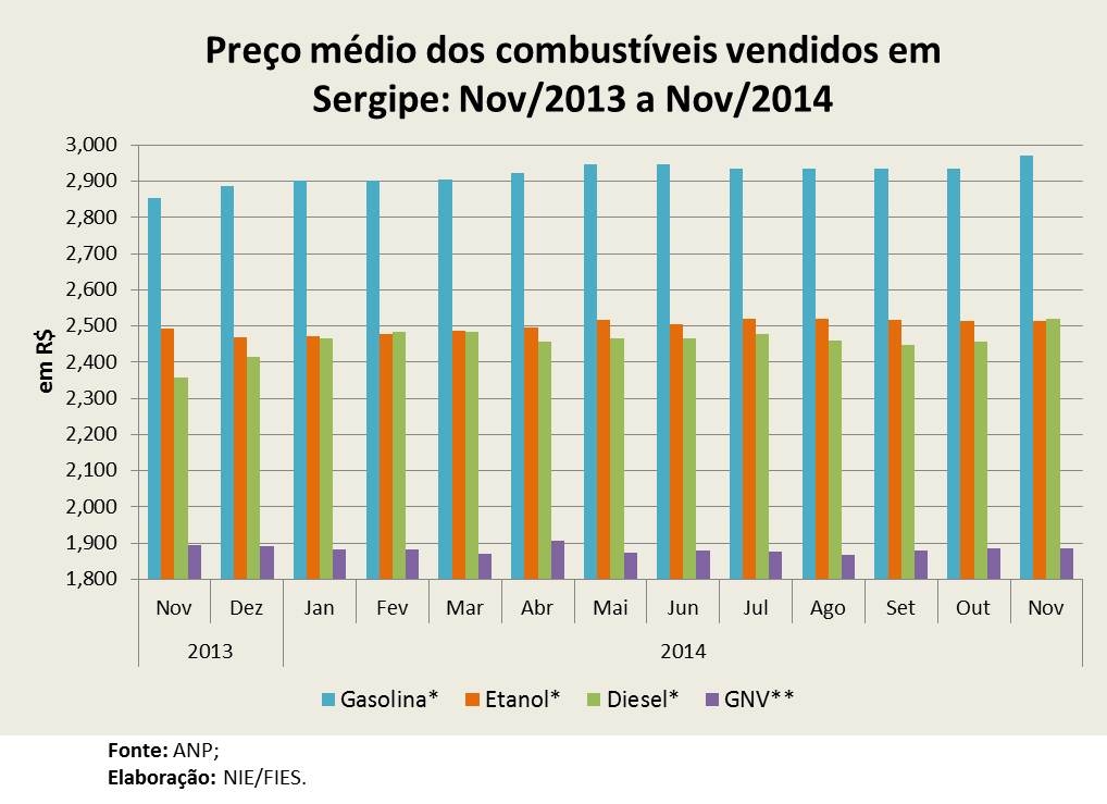 Análise realizada pelo Boletim Sergipe Econômico, parceria do Núcleo de Informações Econômicas da Federação das Indústrias do Estado de Sergipe (FIES) e do Departamento de Economia da UFS, com base nos dados da ANP, apontou que o preço médio da gasolina vendida no estado, em novembro deste ano, aumentou 4,1% na comparação com o mesmo mês do ano passado. Foi cobrado, pelo litro do combustível, o valor médio de R$ 2,970, enquanto que em novembro de 2013 havia sido de R$ 2,853. Em relação ao último mês de outubro, o preço aumentou 1,16%. Os preços encontrados nos postos pesquisados variaram de R$ 2,830 a R$ 3,159.