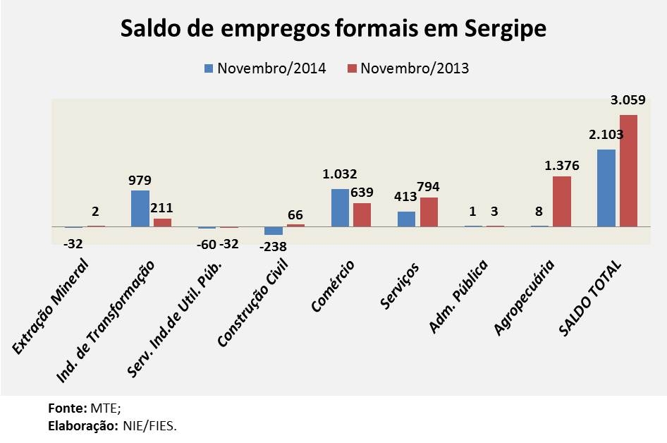 Até novembro de 2014, Sergipe acumula um saldo positivo de empregos formais, tendo gerado 10.594 novas vagas. Deste total, quase metade das vagas foram criadas pelo setor de serviços, com a contratação de 5.176 novos empregos, de janeiro a novembro de 2014. Destacam-se também, neste período, o comércio (2.457 novas vagas) e a construção civil (1.433 novos postos de trabalho).