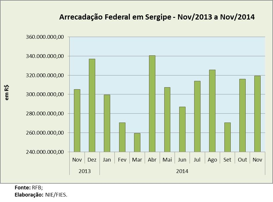 Análise realizada pelo Boletim Sergipe Econômico, parceria do Núcleo de Informações Econômicas da Federação das Indústrias do Estado de Sergipe (FIES) e do Departamento de Economia da UFS, com base nos dados da Receita Federal, verificou que a arrecadação do décimo primeiro mês do ano chegou a R$ 319,4 milhões, assinalando uma queda de 1,7% em relação aos tributos recolhidos em novembro de 2013.