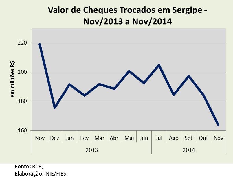 Análise realizada pelo Boletim Sergipe Econômico, parceria do Núcleo de Informações Econômicas (NIE) da Federação das Indústrias do Estado de Sergipe (FIES) e do Departamento de Economia da UFS, com base nos dados do Serasa Experian e do Banco Central, verificou que foram compensados 88,8 mil cheques, em novembro desse ano, em Sergipe. Esse volume foi 12,4% menor que no mesmo mês de 2013, quando foram compensados pouco mais de 101 mil cheques.