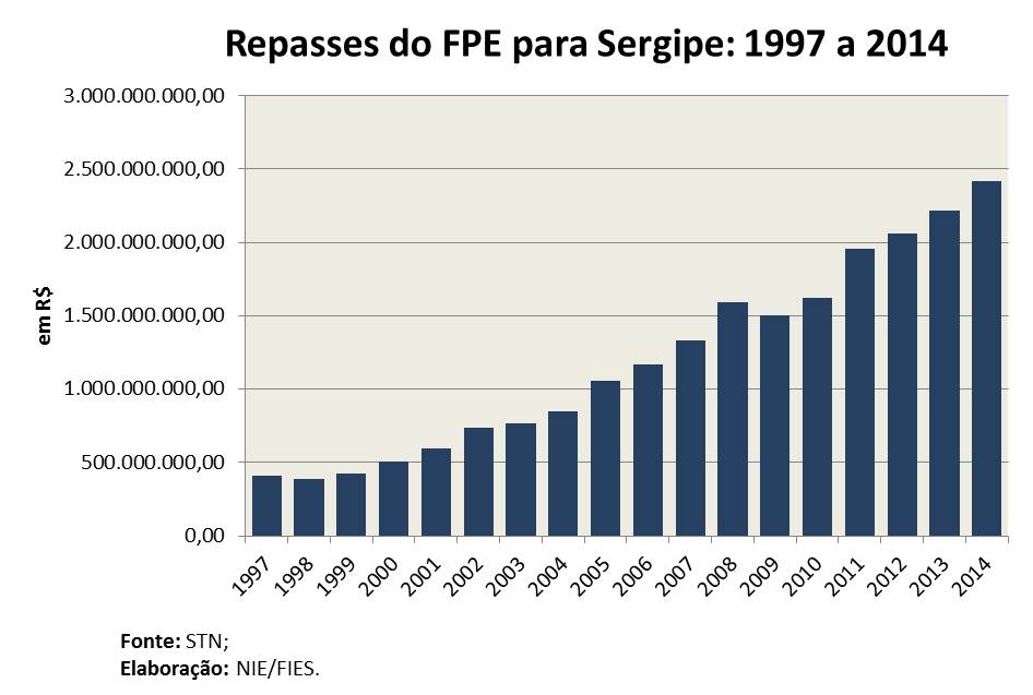 Análise realizada pelo Boletim Sergipe Econômico, parceria do Núcleo de Informações Econômicas da Federação das Indústrias do Estado de Sergipe (FIES) e do Departamento de Economia da UFS, com base nos dados da Secretaria do Tesouro Nacional (STN), indicou que a transferência do Fundo de Participação dos Estados (FPE) para o estado foi de R$ 2,4 bilhões em 2014, com crescimento de 2,6% em termos reais (descontada a inflação do período) em relação a 2013.