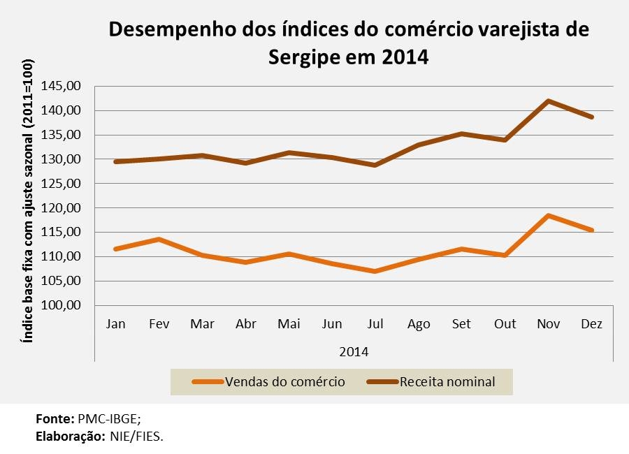 Análise realizada pelo Boletim Sergipe Econômico, parceria do Núcleo de Informações Econômicas da Federação das Indústrias do Estado de Sergipe (FIES) e do Departamento de Economia da UFS, com base nos dados da Pesquisa Mensal do Comércio (PMC) do IBGE, revelou que as vendas do comércio varejista do estado fechou o ano de 2014 com um crescimento de 2,6%, em comparação com 2013. As vendas de dezembro foram 7,3% maior do que no mesmo período do ano anterior (dezembro/2013).