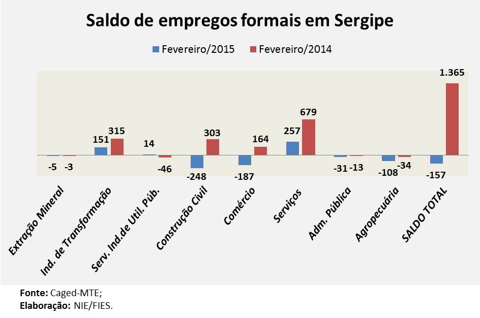 No primeiro bimestre de 2015, Sergipe acumulou um saldo negativo de 506 postos de trabalho neste ano, esta situação é bastante diferente do mesmo período de 2014, cujo saldo de empregos, no primeiro bimestre de 2014, havia sido positivo, com a criação de 2.587 novos empregos.