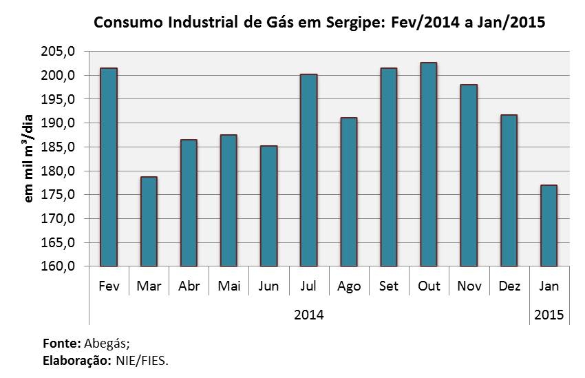 Análise realizada pelo Boletim Sergipe Econômico, parceria do Núcleo de Informações Econômicas (NIE) da Federação das Indústrias do Estado de Sergipe (FIES) e do Departamento de Economia da UFS, com base nos dados da Abegás, apontou que foram consumidos no estado 271,1 mil metros cúbicos (m³), por dia, no primeiro mês do ano. Quando comparado com janeiro de 2014, percebeu-se que o consumo de gás recuou 0,1%. Já na comparação mensal (dezembro/2014) houve redução de 7,2% no consumo.