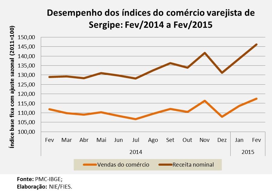 Para a receita nominal do comércio varejista o crescimento foi ainda maior no segundo mês de 2015. A receita nominal obteve crescimento de 11,4% quando comparado com fevereiro de 2014, no estado. Em relação ao primeiro mês do ano (com dados ajustados sazonalmente), a receita nominal apresentou alta de 5,3%.