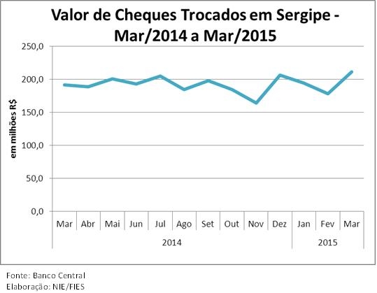 Análise realizada pelo Boletim Sergipe Econômico, parceria do Núcleo de Informações Econômicas (NIE) da Federação das Indústrias do Estado de Sergipe (FIES) e do Departamento de Economia da UFS, com base nas estatísticas do Banco Central, mostrou que, em março desse ano, o valor de cheques trocados em Sergipe registrou R$ 211,4 milhões, sendo 18,7% maior que o valor dos cheques compensados no último mês de fevereiro. Ao se comparar com março do ano passado, o valor transacionado por cheques foi 10,3% maior. No primeiro trimestre desse ano, o valor também apresentou crescimento, ficando 2,8% maior que o mesmo período de 2014.