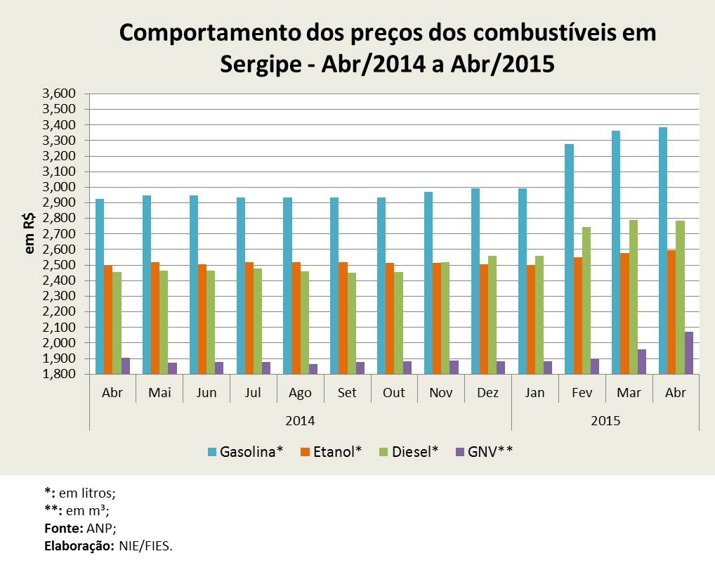 Análise realizada pelo Boletim Sergipe Econômico, parceria do Núcleo de Informações Econômicas (NIE) da Federação das Indústrias do Estado de Sergipe (FIES) e do Departamento de Economia da UFS, com base nos dados da ANP, indicou que o preço médio pago pelo litro da gasolina, no estado, ficou em R$ 3,387, no mês passado. Em termos relativos, houve alta no preço da gasolina vendida de 15,83% sobre abril de 2014.