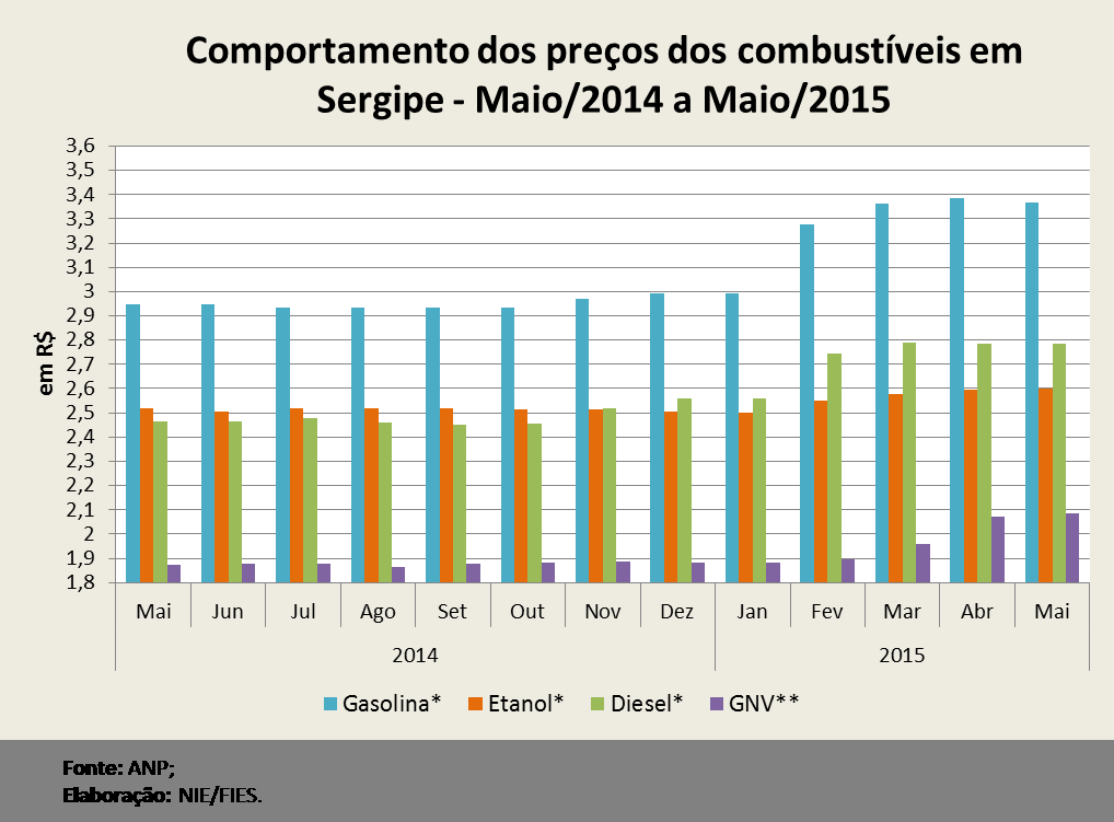 Análise realizada pelo Boletim Sergipe Econômico, parceria do Núcleo de Informações Econômicas (NIE) da Federação das Indústrias do Estado de Sergipe (FIES) e do Departamento de Economia da UFS, com base nos dados da ANP, observou que no último mês de maio, o preço médio vendido pelo litro da gasolina no estado ficou em R$ 3,368, registrando aumento de 14,29% sobre maio de 2014. No comparativo mensal, com abril último, o preço médio recuou 0,56%. De acordo com a coleta de preços realizada pela ANP, o preço mínimo encontrado da gasolina foi de R$ 3,099, enquanto que o preço máximo situou-se em R$ 3,569.