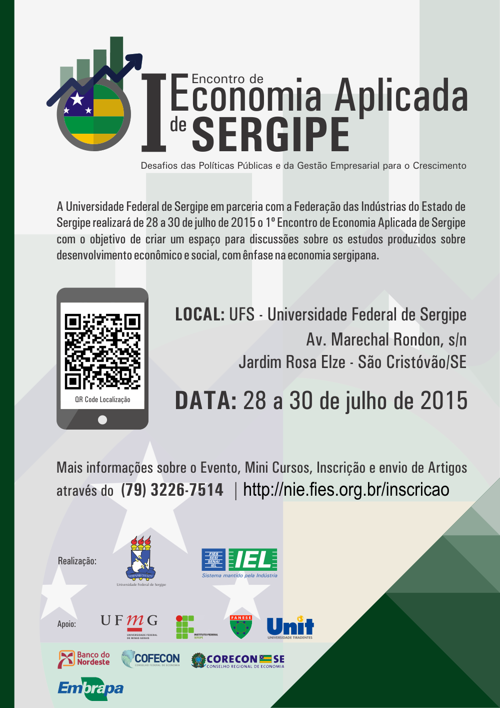 Encontram-se abertas as inscrições para o I Encontro de Economia Aplicada de Sergipe: Desafios das Políticas Públicas e da Gestão Empresarial para o Crescimento, que acontecerá nos dias 28 a 30 de julho de 2015, em Aracaju(SE). O evento é promovido pela Federação das Indústrias do Estado de Sergipe (FIES), por meio do Instituto Euvaldo Lodi (IEL), e pela Universidade Federal de Sergipe (UFS), através do Núcleo de Pós Graduação em Economia (NUPEC) e do Departamento de Economia (DEE).