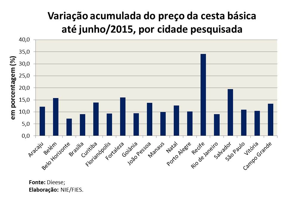 Em relação ao mês de maio, o preço da cesta básica de Aracaju caiu 0,6%, acompanhando a tendência de queda das outras capitais, as exceções foram Recife, Belém, João Pessoa e Manaus, que apresentaram elevação no preço da cesta básica. Enquanto isso, em relação ao mês de junho de 2014, a cesta básica de Aracaju apresentou crescimento de 11,2% (sem levar em consideração a inflação do período). A cidade de Recife apresentou maior crescimento na comparação mensal e na comparação anual, com 16% e 24,9%, respectivamente. Na cidade de São Paulo foi registrada a cesta básica mais cara entre as capitais brasileiras, custando R$ 392,77.