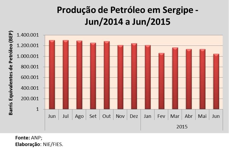 Análise realizada pelo Boletim Sergipe Econômico, parceria do Núcleo de Informações Econômicas da Federação das Indústrias do Estado de Sergipe (FIES) e do Departamento de Economia da UFS, com base nos dados da ANP, mostrou que a produção de petróleo no estado, em junho de 2015, ficou na faixa de 1 milhão de barris equivalentes de petróleo (bep), o que representou um recuo de 8,2%, em relação ao mês anterior (maio/2015). Comparando-se com o mesmo mês do ano passado, a produção se mostrou 19,9% menor. No primeiro semestre de 2015, a produção no estado chegou a 6,7 milhões de barris, ficando 14,8% inferior à produção do mesmo período de 2014.