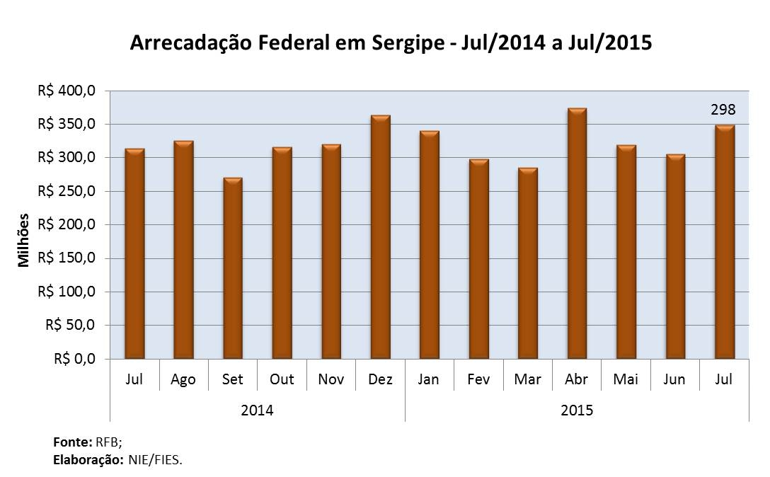 Análise realizada pelo Boletim Sergipe Econômico, parceria do Núcleo de Informações Econômicas (NIE) da Federação das Indústrias do Estado de Sergipe (FIES) e do Departamento de Economia da UFS, com base nos dados da Receita Federal, verificou que a arrecadação do sétimo mês do ano chegou a R$ 347,7 milhões, o que representou um crescimento de 1,2% em relação aos tributos recolhidos em julho de 2014. Em relação ao último mês de junho, houve aumento de 13,4% na arrecadação, ambas as variações em termos reais (valores descontados pela inflação).