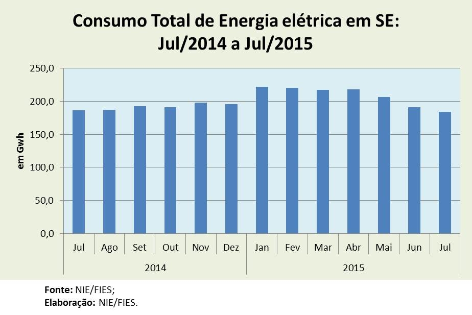 Análise realizada pelo Boletim Sergipe Econômico, parceria do Núcleo de Informações Econômicas (NIE) da Federação das Indústrias do Estado de Sergipe (FIES) e do Departamento de Economia da UFS, com base nos dados da Energisa, (que gera e distribui energia para 63 municípios sergipanos, alcançando 96% do território do estado), constatou que houve recuo de 1,2% no consumo de energia elétrica, na comparação entre julho de 2015 e o mesmo mês de 2014, em Sergipe. No comparativo com junho passado, este recuo foi de 3,7% no consumo, registrando um consumo de 184 Gigawatts-hora (Gwh) no mês analisado.