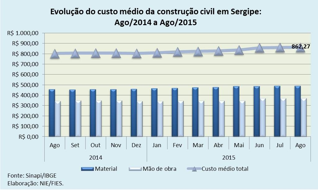 Análise realizada pelo Boletim Sergipe Econômico, parceria do Núcleo de Informações Econômicas (NIE) da Federação das Indústrias do Estado de Sergipe (FIES) e do Departamento de Economia da UFS, com base nos dados do Sistema Nacional de Pesquisa de Custos e Índices da Construção Civil (Sinapi), calculado pelo IBGE em convênio com a Caixa, revelou que o custo da construção ficou praticamente estável no oitavo mês do ano, com leve crescimento de 0,07%, em relação ao último mês de julho. Na comparação anual, mesmo mês de 2014, o custo elevou-se 7,39%, as variações são em termos nominais, ou seja, sem considerar a inflação do período.