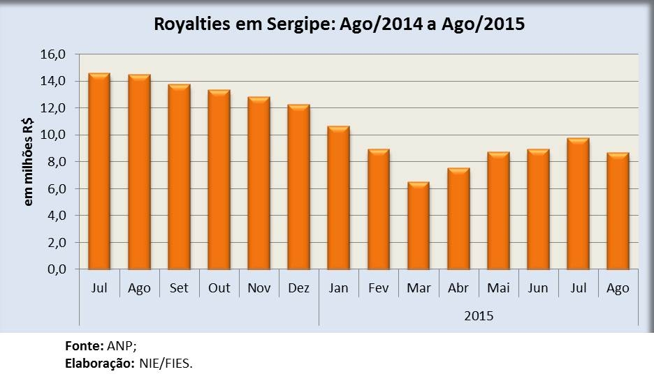 Análise realizada pelo Boletim Sergipe Econômico, uma parceria do Núcleo de Informações Econômicas (NIE) da Federação das Indústrias do Estado de Sergipe (FIES) e do Departamento de Economia da UFS, com base nos dados da ANP, indicou que o pagamento de royalties do petróleo e gás natural, para o estado de Sergipe, no mês de agosto, chegou a R$ 8,4 milhões, valor referente à produção do sexto mês do ano.