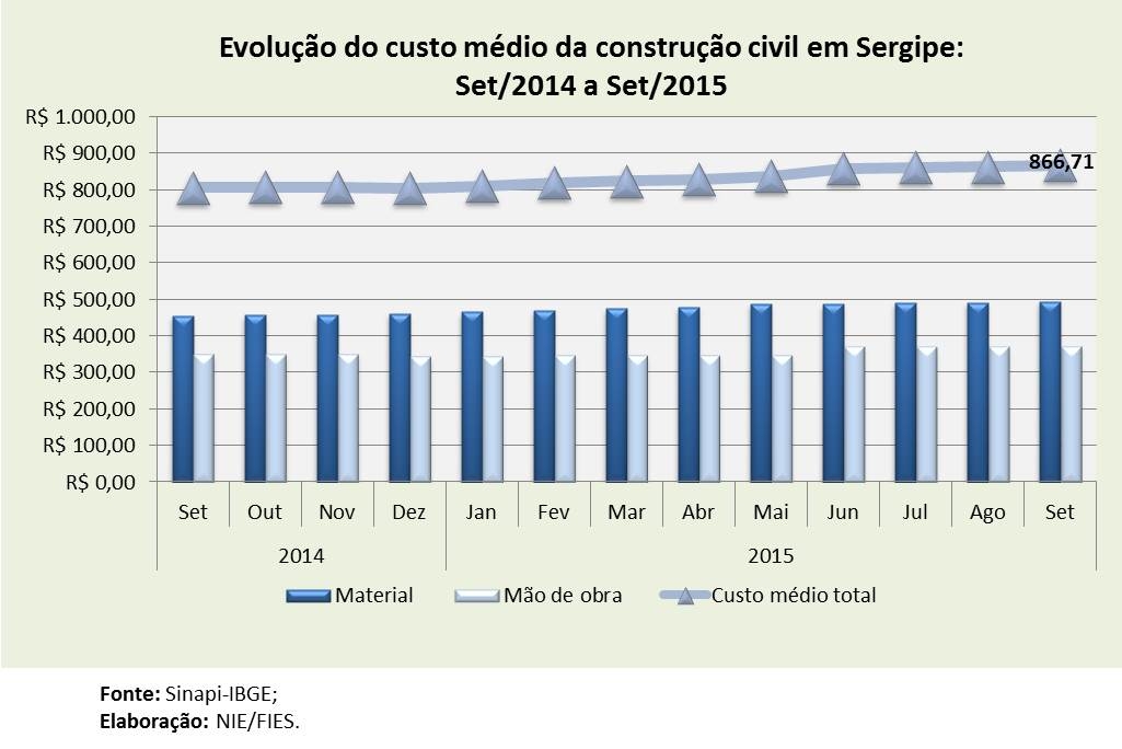 Análise realizada pelo Boletim Sergipe Econômico, parceria do Núcleo de Informações Econômicas (NIE) da Federação das Indústrias do Estado de Sergipe (FIES) e do Departamento de Economia da UFS, com base nos dados do Sistema Nacional de Pesquisa de Custos e Índices da Construção Civil (Sinapi), calculado pelo IBGE em convênio com a Caixa, revelou que o custo da construção aumentou 0,5% em setembro deste ano, quando comparado com o último mês de agosto. Na comparação anual, em relação a setembro de 2014, o custo elevou-se 7,5%, as variações são em termos nominais, ou seja, sem considerar a inflação do período.