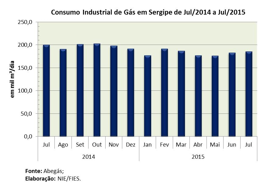 Análise realizada pelo Boletim Sergipe Econômico, parceria do Núcleo de Informações Econômicas (NIE) da Federação das Indústrias do Estado de Sergipe (FIES) e do Departamento de Economia da UFS, com base nos dados da Associação Brasileira das Empresas Distribuidoras de Gás Canalizado (ABEGÁS), apontou que foram consumidos, no sétimo mês do ano, uma média de 185,5 mil metros cúbicos (m³) de gás diário, pelas indústrias sergipanas. O consumo industrial de gás foi 1,5% maior que o consumo do mês de junho. Na comparação anual, em relação ao mesmo mês do ano passado (julho/2014), o consumo apresentou redução de 7,4%.