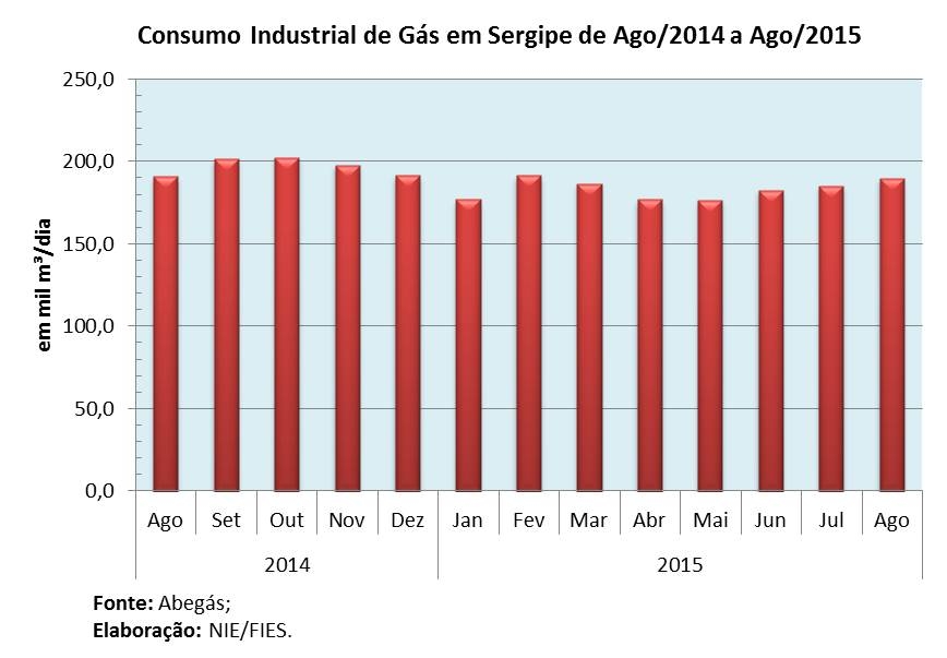 Análise realizada pelo Boletim Sergipe Econômico, parceria do Núcleo de Informações Econômicas (NIE) da Federação das Indústrias do Estado de Sergipe (FIES) e do Departamento de Economia da UFS, com base nos dados da Associação Brasileira das Empresas Distribuidoras de Gás Canalizado (ABEGÁS), apontou que, em agosto desse ano, o consumo de gás em todo o estado chegou a 285 mil metros cúbicos (m³) por dia, com leve queda de 0,6% no comparativo anual (agosto/2014), além de um consumo 1% menor no acumulado do ano, comparando-se com o mesmo período do ano anterior. Porém, comparando com o mês imediatamente anterior (julho/2015) o consumo foi 2,2% maior.