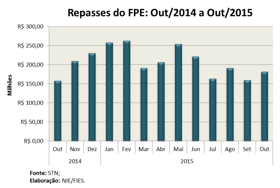 Em relação ao mês anterior, setembro último, a transferência ficou aproximadamente 13% maior. Com os dados de outubro, as transferências do fundo totalizaram mais de R$ 2 bilhões repassados aos cofres do estado, de janeiro até o mês de outubro. Em termos relativos, verificou-se queda real de 2,1% em relação ao mesmo período de 2014.