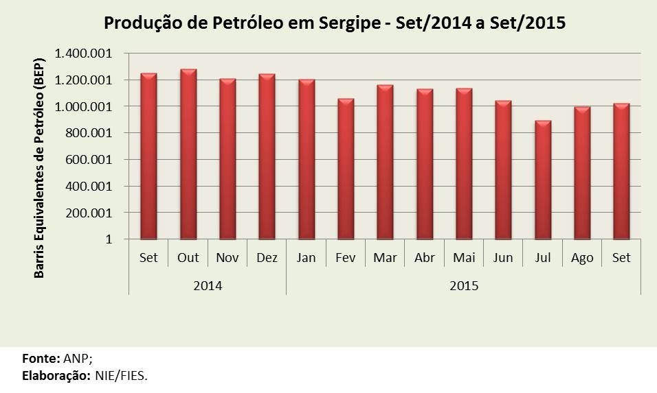 Análise realizada pelo Boletim Sergipe Econômico, parceria do Núcleo de Informações Econômicas (NIE) da Federação das Indústrias do Estado de Sergipe (FIES) e do Departamento de Economia da UFS, com base nos dados da ANP, mostrou que a produção de petróleo no estado, em setembro de 2015, totalizou 1 milhão de barris equivalentes de petróleo (bep), estando 2,7% maior que o observado no mês anterior (agosto/2015). Comparando-se com o mesmo mês do ano passado, a produção também foi menor, sendo 17,9% inferior.
