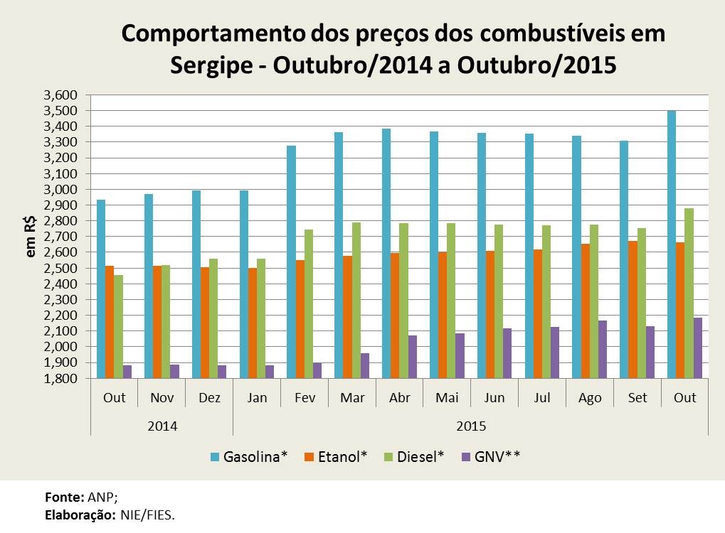 Análise realizada pelo Boletim Sergipe Econômico, parceria do Núcleo de Informações Econômicas (NIE) da Federação das Indústrias do Estado de Sergipe (FIES) e do Departamento de Economia da UFS, com base nos dados da ANP, observou que décimo mês do ano, o preço médio vendido pelo litro da gasolina no estado ficou em R$ 3,499, elevando-se em 19,1% sobre outubro de 2014, variações sem considerar a inflação do período. O preço mínimo encontrado da gasolina foi de R$ 3,240, enquanto que o preço máximo situou-se em R$ 3,739. No comparativo, com o mês de setembro deste ano, notou-se avanço de 5,8%.