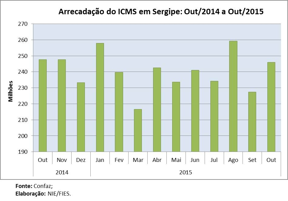 Análise realizada pelo Boletim Sergipe Econômico, parceria do Núcleo de Informações Econômicas (NIE) da Federação das Indústrias do Estado de Sergipe (FIES) e do Departamento de Economia da UFS, com base nos dados do Confaz, apontou que a arrecadação do ICMS no estado recuou 9,7%, em outubro deste ano, descontando a inflação do período, medida pelo Índice de Preços ao Consumidor Ampliado (IPCA). Essa variação é em relação a outubro de 2014.