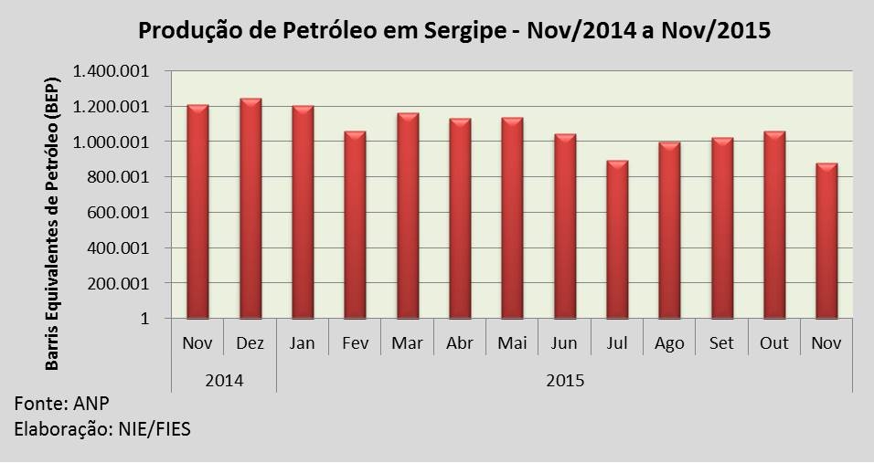 A produção de petróleo no estado, em novembro de 2015, foi de 882 mil bep, sendo 16,8% menor, em relação ao mês anterior (outubro/2015). Comparando-se com o mesmo mês do ano passado, a produção se mostrou 27% menor, também foi registrada uma queda, no acumulado do ano, com retração de 18,5%, em relação ao mesmo período do ano passado.