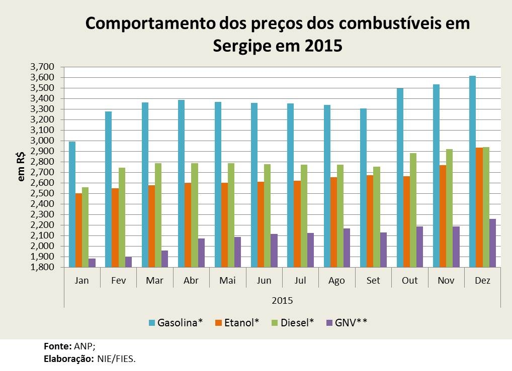 Análise realizada pelo Boletim Sergipe Econômico, parceria do Núcleo de Informações Econômicas (NIE) da Federação das Indústrias do Estado de Sergipe (FIES) e do Departamento de Economia da UFS, com base nos dados da ANP, observou que no ano passado houve elevação no preço médio de todos os combustíveis. O preço médio cobrado pelo litro da gasolina vendida no estado subiu 20,8% em relação a 2014. Em dezembro último, a cotação média do combustível ficou em R$ 3,617, subindo 2,3% em relação ao mês imediatamente anterior (novembro/2015). Valores e variações em termos absolutos, ou seja, sem considerar a inflação do período.