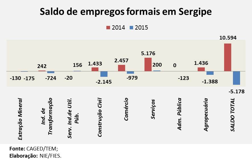 Análise realizada pelo Boletim Sergipe Econômico, parceria do Núcleo de Informações Econômicas (NIE) da Federação das Indústrias do Estado de Sergipe (FIES) e do Departamento de Economia da UFS, com dados do Cadastro Geral de Empregados e Desempregados (Caged), do MTE, indicou que, em 2015, o saldo (total de admissões menos total de desligamentos) foi de -5.178 empregos formais, no estado. O resultado do ano é fruto da diferença entre 109.941 admissões e 115.119 demissões.