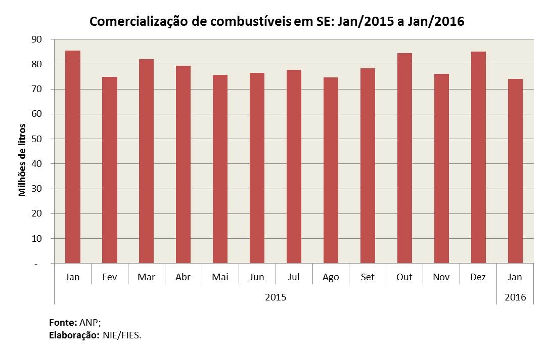 Análise realizada pelo Boletim Sergipe Econômico, parceria do Núcleo de Informações Econômicas (NIE) da Federação das Indústrias do Estado de Sergipe (FIES) e do Departamento de Economia da UFS, com base nos dados da ANP, indicou que as vendas de combustíveis no estado atingiram pouco mais de 74 milhões de litros, no primeiro mês de 2016, registrando queda de 13,3% em relação ao mesmo mês de 2015. No comparativo com o mês imediatamente anterior, dezembro último, também houve queda de 13% nas vendas.