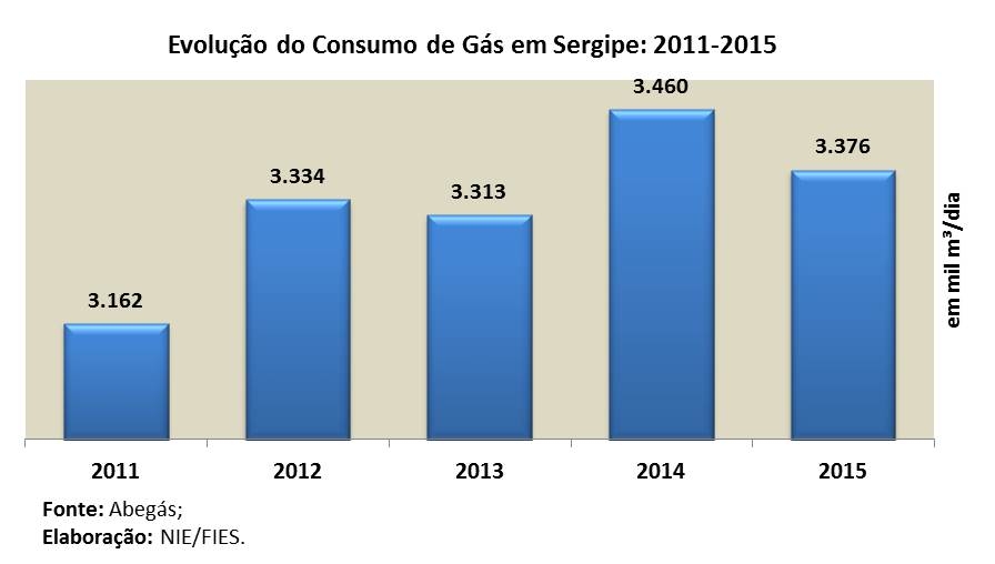 Análise realizada pelo Boletim Sergipe Econômico, parceria do Núcleo de Informações Econômicas (NIE) da Federação das Indústrias do Estado de Sergipe (FIES) e do Departamento de Economia da UFS com base nos dados da Abegás, verificou que foram consumidos, em dezembro de 2015, uma média de 303,1 mil metros cúbicos (m³) de gás diariamente no estado. Este consumo foi 9,3% superior ao mês anterior, novembro de 2015, enquanto que no comparativo com o mesmo mês de 2014, o total de gás consumido foi 2,8% maior.
