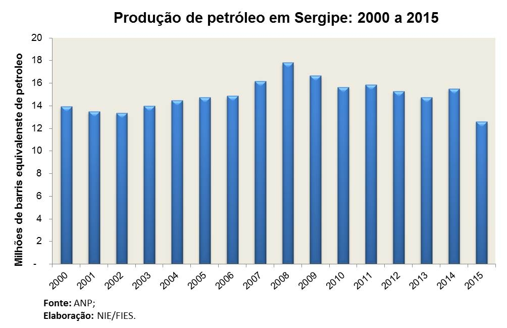 Análise realizada pelo Boletim Sergipe Econômico, parceria do Núcleo de Informações Econômicas (NIE) da Federação das Indústrias do Estado de Sergipe (FIES) e do Departamento de Economia da UFS, com base nos dados da ANP, mostrou que a produção, em 2015, de petróleo no estado foi superior a 12,5 milhões de barris equivalentes de petróleo (BEP), um volume 18,8% abaixo do produzido em 2014. Na comparação mensal, a produção de petróleo foi 11,2% maior, em relação ao último mês de novembro.