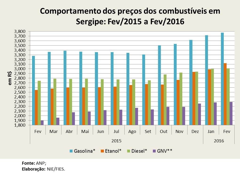 Análise realizada pelo Boletim Sergipe Econômico, parceria do Núcleo de Informações Econômicas (NIE) da Federação das Indústrias do Estado de Sergipe (FIES) e do Departamento de Economia da UFS, com base nos dados da ANP, observou que no segundo mês do ano, o preço médio cobrado pelo litro da gasolina no estado ficou em R$ 3,770, elevando-se em 15% sobre o preço médio de fevereiro de 2015. Em relação ao primeiro mês do ano corrente, houve evolução de 1,4%.