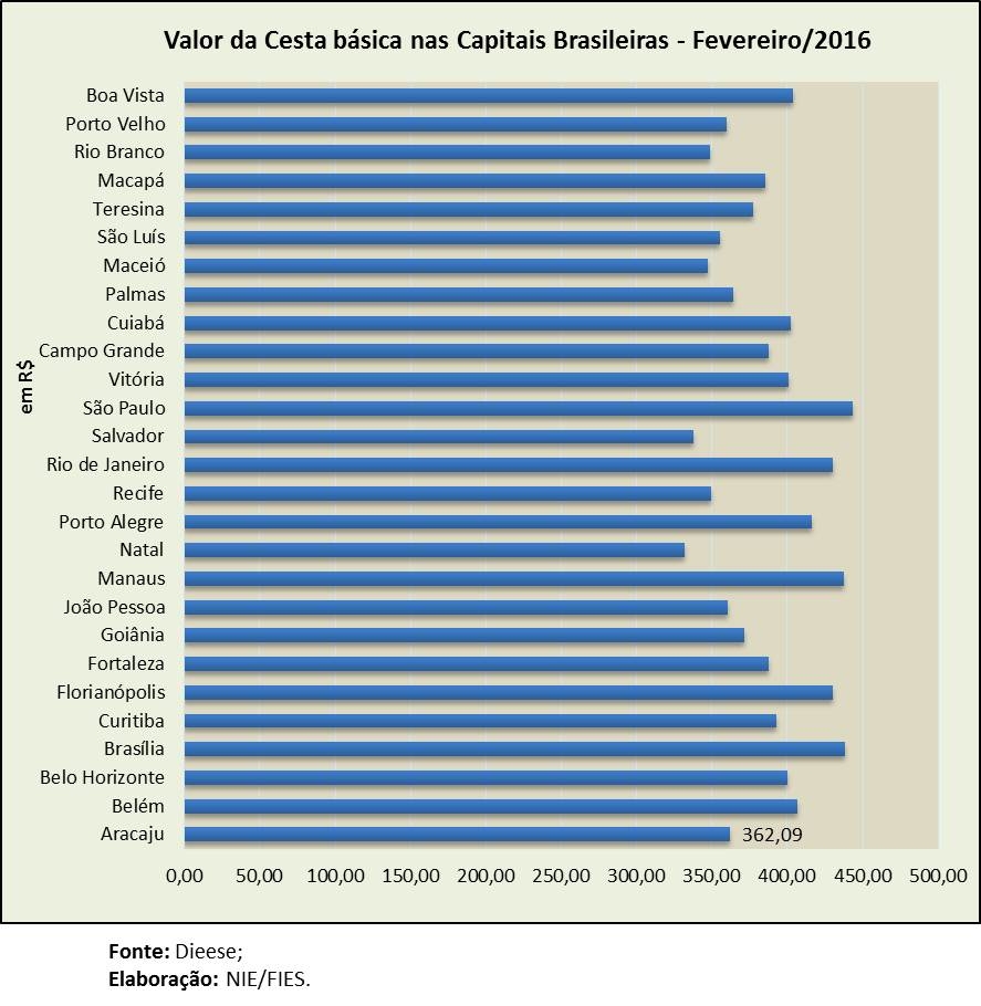 Análise realizada pelo Boletim Sergipe Econômico, parceria do Núcleo de Informações Econômicas (NIE) da Federação das Indústrias do Estado de Sergipe (FIES) e do Departamento de Economia da UFS, com base nos dados da Pesquisa Nacional da Cesta Básica, realizada pelo DIEESE, apontou que o valor da cesta básica registrado na capital sergipana, em fevereiro deste ano, foi R$ 362,09. Desde janeiro de 2016, o DIEESE está publicando o resultado para as 27 capitais brasileiras. Os menores valores foram observados em Natal (R$ 331,79), Salvador (R$ 337,84) e Maceió (R$ 347,38). Já os maiores custos da cesta básica foram registrados em São Paulo (R$ 443,40), Brasília (R$ 438,69) e Manaus (R$ 437,86).