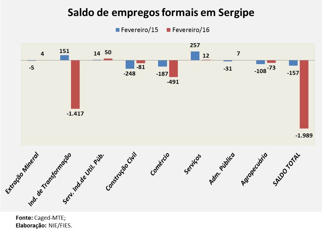No primeiro bimestre de 2016, Sergipe acumula um saldo negativo de empregos formais, tendo reduzido 2.372 postos de trabalho para os sergipanos. O resultado negativo dos dois primeiros meses do ano, está atrelado ao elevado número de desligamentos da Indústria de transformação (-1.708), do comércio (-793) e em seguida a agropecuária (-195). Do lado oposto, o setor da Construção Civil criou 179 novos empregos no mês, enquanto que no mesmo mês do ano anterior o setor registrou uma redução de 301 postos de trabalho.