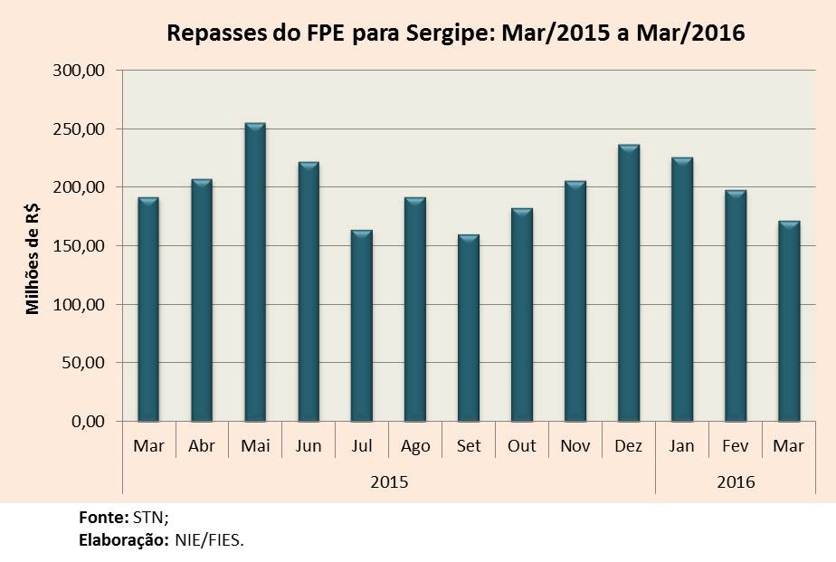 Análise realizada pelo Boletim Sergipe Econômico, parceria do Núcleo de Informações Econômicas (NIE) da Federação das Indústrias do Estado de Sergipe (FIES) e do Departamento de Economia da UFS, com base nos dados da Secretaria do Tesouro Nacional (STN), indicou que o repasse do Fundo de Participação dos Estados (FPE) para o estado de Sergipe, no terceiro mês do ano, alcançou R$ 171,4 milhões, registrando retração de 18,4% em termos reais (descontando a inflação, medida pelo IPCA), em comparação com o mês de março de 2015. Em relação ao segundo mês do ano, fevereiro último, a transferência foi 13,6% menor.
