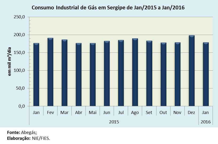 Análise realizada pelo Boletim Sergipe Econômico, parceria do Núcleo de Informações Econômicas (NIE) da Federação das Indústrias do Estado de Sergipe (FIES) e do Departamento de Economia da UFS, com base nos dados da Associação Brasileira das Empresas Distribuidoras de Gás Canalizado (ABEGÁS), apontou que foram consumidos, no primeiro mês do ano, uma média de 276,4 mil metros cúbicos (m³) de gás diário. Em relação ao mês de dezembro de 2015, houve retração de 8,8% no consumo de gás. Na comparação anual, em relação ao mesmo mês do ano passado (Janeiro/2015), o total de gás consumido foi 1,1% maior.
