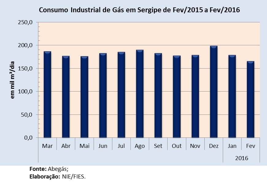 Análise realizada pelo Boletim Sergipe Econômico, parceria do Núcleo de Informações Econômicas (NIE) da Federação das Indústrias do Estado de Sergipe (FIES) e do Departamento de Economia da UFS, com base nos dados da Associação Brasileira das Empresas Distribuidoras de Gás Canalizado (ABEGÁS), apontou que foram consumidos, no segundo mês do ano, uma média de 165,8 mil metros cúbicos (m³) de gás diário, pelas indústrias sergipanas. O consumo industrial de gás foi 7,4% menor que o consumo do mês de janeiro último. Na comparação anual, em relação ao mesmo mês do ano passado (fevereiro/2015), o consumo apresentou redução de 13,5%.