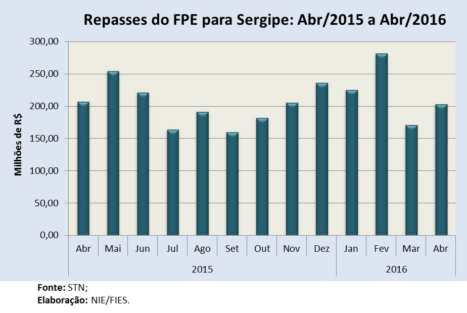 Análise realizada pelo Boletim Sergipe Econômico, parceria do Núcleo de Informações Econômicas (NIE) da Federação das Indústrias do Estado de Sergipe (FIES) e do Departamento de Economia da UFS, com base nos dados da Secretaria do Tesouro Nacional (STN), indicou que o repasse do Fundo de Participação dos Estados (FPE) para o estado de Sergipe, no quarto mês do ano, alcançou R$ 203,8 milhões, registrando retração de 10% em termos reais (descontando a inflação, medida pelo Índice Nacional de Preço ao Consumidor Amplo-IPCA), em comparação com o mês de abril de 2015. Porém, quando comparado com o mês imediatamente anterior, as transferências aumentaram, ficando 18,2% maior.