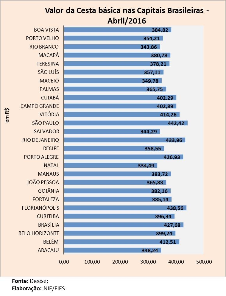 Análise realizada pelo Boletim Sergipe Econômico, parceria do Núcleo de Informações Econômicas (NIE) da Federação das Indústrias do Estado de Sergipe (FIES) e do Departamento de Economia da UFS, com base nos dados da Pesquisa Nacional da Cesta Básica, realizada pelo DIEESE, apontou que o valor da cesta básica registrado na capital sergipana, em abril deste ano, foi de R$ 348,24, sendo o quarto menor entre as capitais brasileiras. Desde janeiro de 2016, o DIEESE vem publicando os resultados das 27 capitais brasileiras. Os menores valores registrados no mês foram observados em Natal (R$ 334,49), Rio Branco (R$ 343,86) e Salvador (R$ 344,29). Já os maiores custos da cesta básica foram registrados em São Paulo (R$ 442,42), Florianópolis (R$ 438,56) e Rio de Janeiro (R$ 433,96).