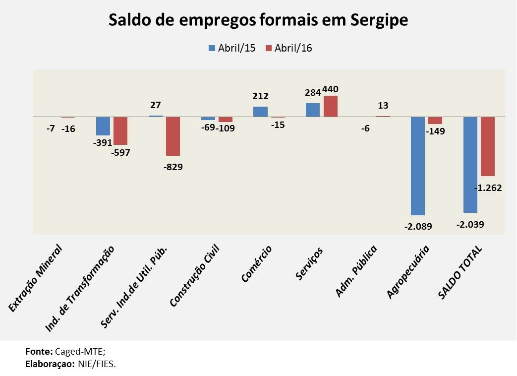 Entre os municípios sergipanos com mais de 30 mil habitantes, Aracaju apresentou o maior saldo negativo, com a redução de 1.000 empregos formais, só em abril de 2016. Nossa Senhora do Socorro e Capela, também apresentaram saldos negativos, de 153 e 92, respectivamente, no mês em análise. A cidade de Lagarto e Itabaiana, por exemplo, apresentaram saldos positivos de emprego em abril, 120 e 47, novos empregos formais respectivamente.