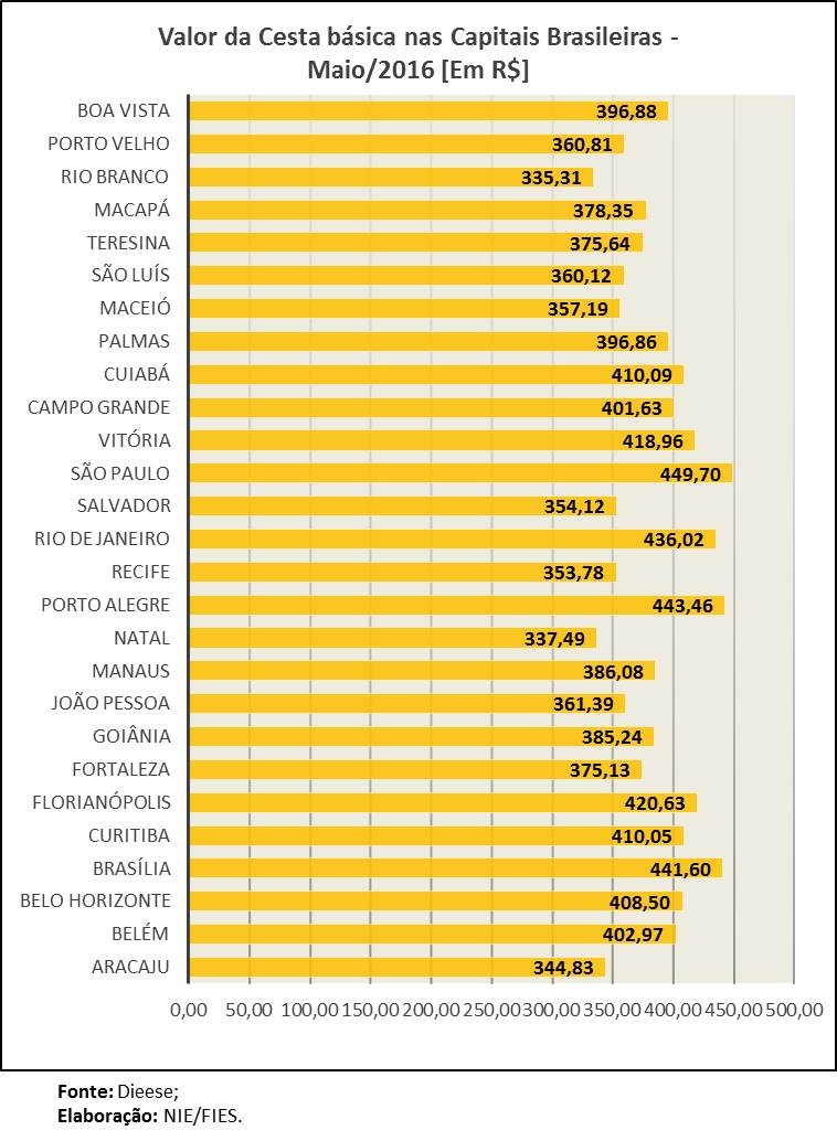 Análise realizada pelo Boletim Sergipe Econômico, parceria do Núcleo de Informações Econômicas (NIE) da Federação das Indústrias do Estado de Sergipe (FIES) e do Departamento de Economia da UFS, com base nos dados da Pesquisa Nacional da Cesta Básica, realizada pelo DIEESE, apontou que o valor da cesta básica registrado na capital sergipana, em maio deste ano, foi de R$ 344,83, sendo o terceiro menor entre as capitais brasileiras. Desde janeiro de 2016, o DIEESE vem publicando os resultados das 27 capitais brasileiras. Os menores valores registrados no mês foram observados em Rio Branco (R$ 335,31) e Natal (R$ 337,49). Já os maiores custos da cesta básica foram registrados em São Paulo (R$ 449,70), Porto Alegre (R$ 443,46) e Brasília (R$ 441,60).