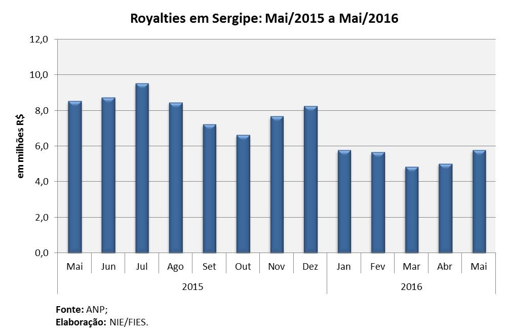 Análise realizada pelo Boletim Sergipe Econômico, uma parceria do Núcleo de Informações Econômicas (NIE) da Federação das Indústrias do Estado de Sergipe (FIES) e do Departamento de Economia da UFS, com base nos dados da Agência Nacional do Petróleo, Gás Natural e Biocombustíveis (ANP), indicou que o pagamento de royalties do petróleo e gás natural, para o estado, no quinto mês de 2016, foi de R$ 5,7 milhões, valor referente à produção do terceiro mês do ano. No comparativo com o mês imediatamente anterior, abril último, o repasse cresceu 15,2%. Porém, ainda persiste uma retração em relação ao mês de maio do ano passado, redução de 32,1%, variações em termos absolutos, ou seja, sem considerar a inflação no período.
