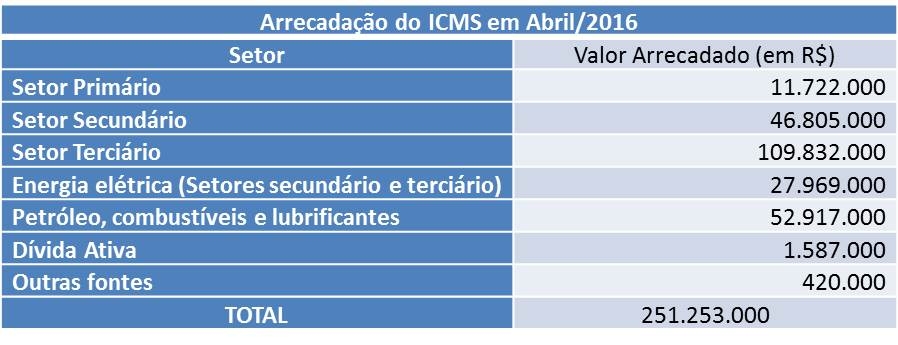 No acumulado do ano, de janeiro a abril de 2016, a arrecadação do ICMS ficou um pouco acima dos R$ 972,8 milhões, registrando recuo de 7,5%, em termos reais, em comparação com o mesmo período de 2015.