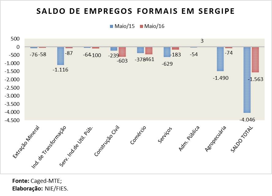 Entre os setores pesquisados, apenas a Administração pública apresentou saldo positivo, 3 novos empregos. Os demais setores apresentaram saldos negativos, o pior resultado foi observado na Indústria da construção, com saldo negativo de 603 empregos, a área da construção de edifícios contabilizou saldo negativo de 468 vagas, no mês de maio de 2016. O segundo maior saldo negativo de empregos foi o comércio, que apresentou saldo negativo de 461 vagas de emprego, com destaque para o comércio varejista, que fechou o mês com 304 empregos a menos, no mês em análise. Os setores de Serviços e da Indústria de transformação, também apresentaram saldos negativos de 183 e 100 empregos, respectivamente.