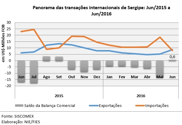 Análise realizada pelo Centro Internacional de Negócios – CIN/SE da Federação das Indústrias do Estado de Sergipe (FIES), com base nos dados do Ministério de Desenvolvimento, Indústria e Comércio Exterior (MDIC), observou-se que as exportações, no sexto mês do ano, superaram os US$ 8,6 milhões, enquanto as importações sergipanas ficaram em US$ 8 milhões. Com este resultado, a balança comercial de Sergipe registrou, no mês analisado, um superávit (saldo positivo) de US$ 593,6 mil, o primeiro superávit desde setembro de 2015.