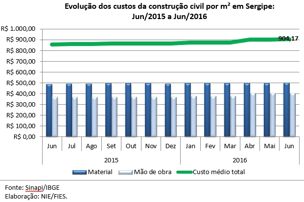 Análise realizada pelo Boletim Sergipe Econômico, parceria do Núcleo de Informações Econômicas (NIE) da Federação das Indústrias do Estado de Sergipe (FIES) e do Departamento de Economia da UFS, com base nos dados do Sistema Nacional de Pesquisa de Custos e Índices da Construção Civil (Sinapi), calculado pelo IBGE em convênio com a Caixa, revelou que o custo da construção, medido por metro quadrado, em Sergipe teve um leve aumento de 0,35% em junho deste ano, quando comparado com o mês imediatamente anterior, maio último. O valor do custo médio por metro quadrado em Sergipe ficou em R$ 904,17, sendo o terceiro menor valor registrado entre os estados brasileiros, no período analisado.
