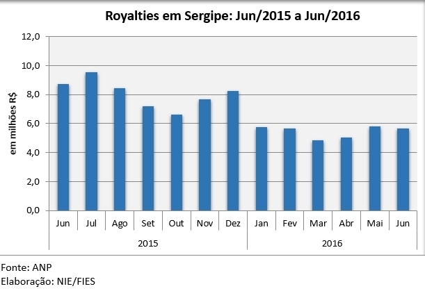 Análise realizada pelo Boletim Sergipe Econômico, uma parceria do Núcleo de Informações Econômicas (NIE) da Federação das Indústrias do Estado de Sergipe (FIES) e do Departamento de Economia da UFS, com base nos dados da Agência Nacional do Petróleo, Gás Natural e Biocombustíveis (ANP), indicou que o pagamento de royalties do petróleo e gás natural, para o estado, no mês de junho de 2016, foi de R$ 5,6 milhões, valor referente à produção do quarto mês do ano. No comparativo com o mês imediatamente anterior, maio último, o repasse recuou 2,3%. Já a retração em relação ao mês de junho do ano passado, foi de 35,2%, variações em termos absolutos, ou seja, sem considerar a inflação no período.
